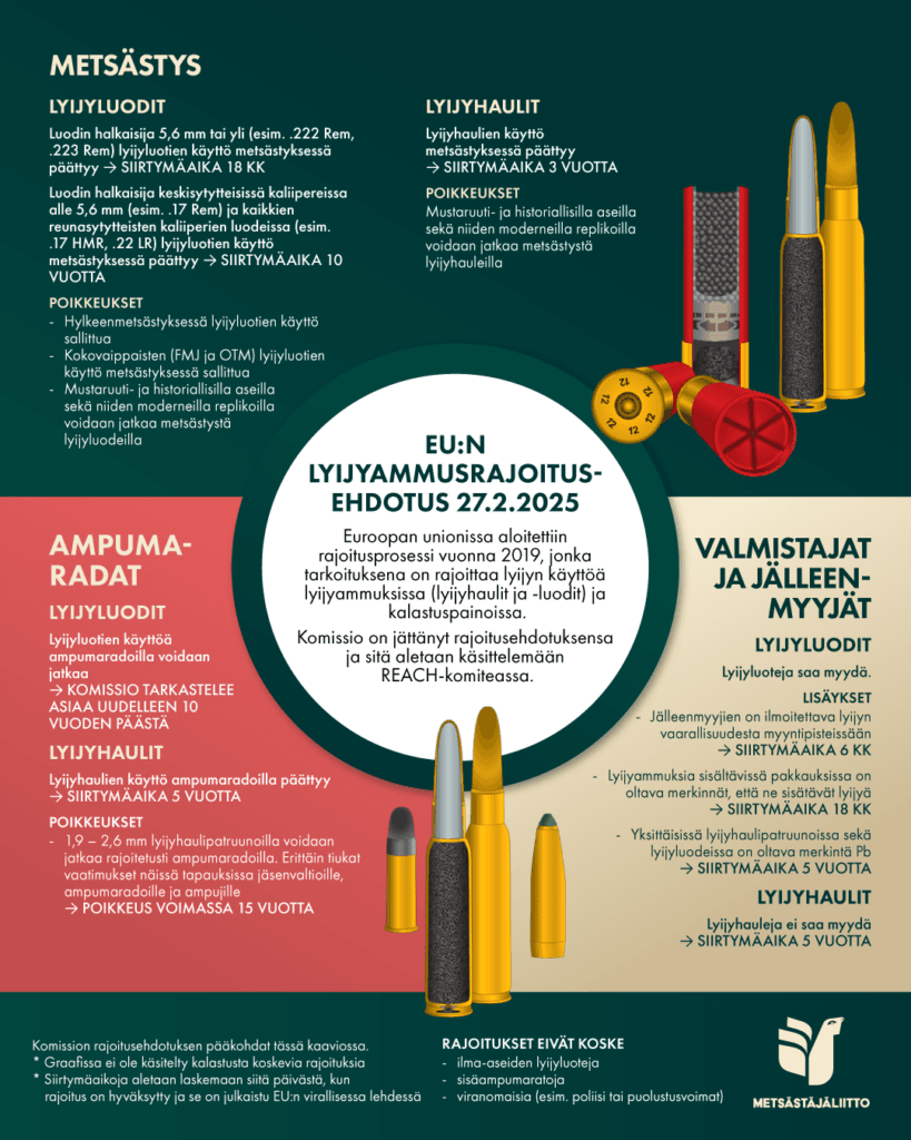 Helmikuun 2025 lopussa julkaistiin pitkään valmisteltu Euroopan komission oikeudellinen ehdotus lyijyn käytön rajoittamisesta ammuksissa ja kalastusvälineissä. Rajoitusten on tarkoitus vähentää ihmisten terveyteen ja ympäristöön kohdistuvia riskejä. Ensimmäinen esittely tehtiin EU:n REACH-komiteassa 27. helmikuuta. Komitea koostuu EU:n jäsenvaltioiden ja komission kansallisista edustajista. Nyt asiasta alkaa keskustelu REACH-komiteassa, jonka seuraava kokous on huhtikuussa.