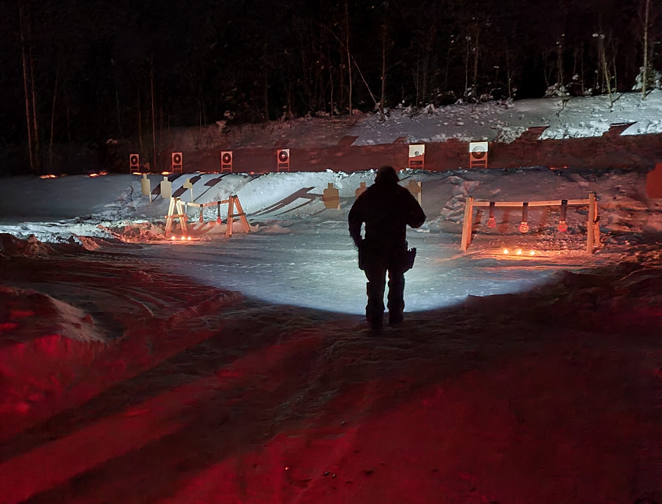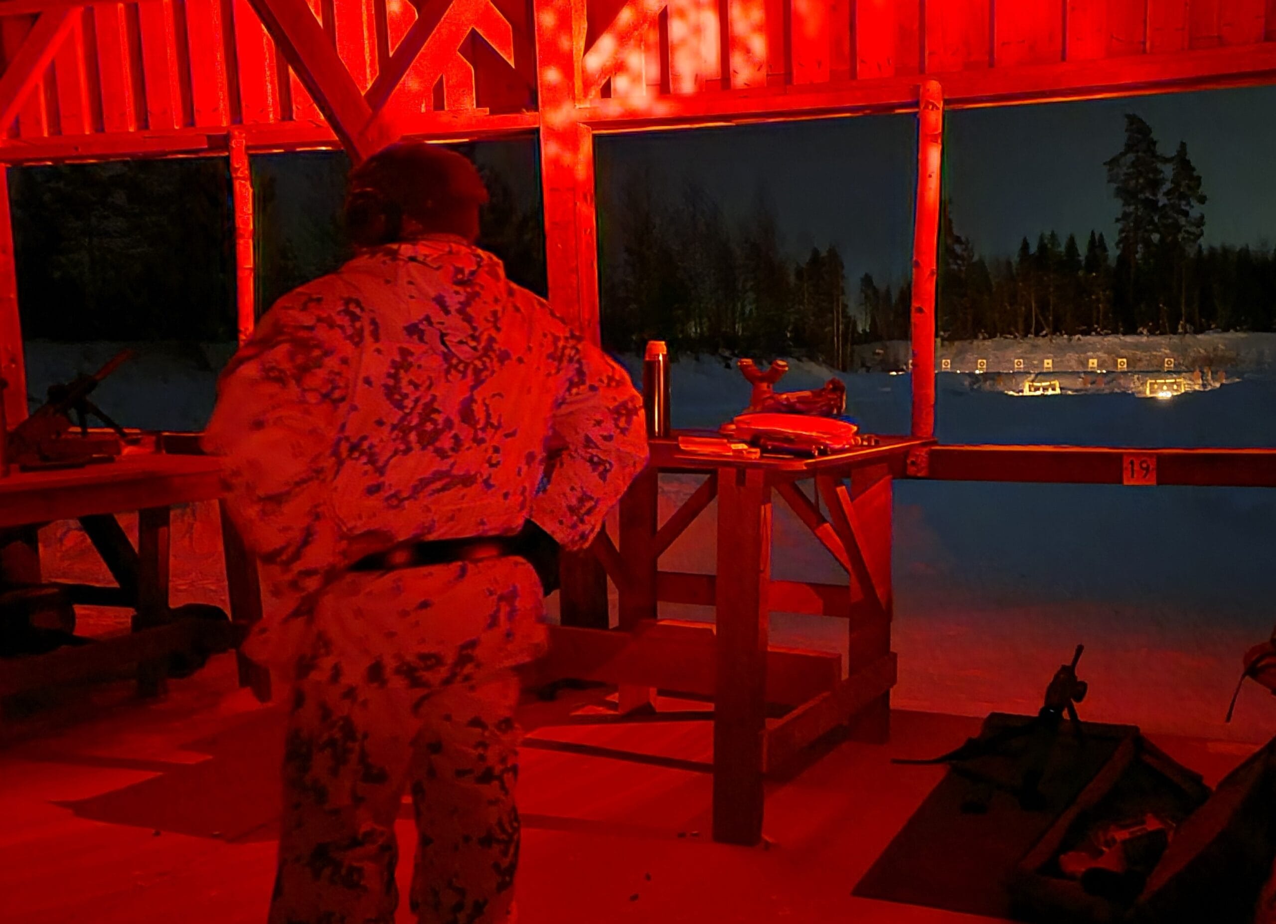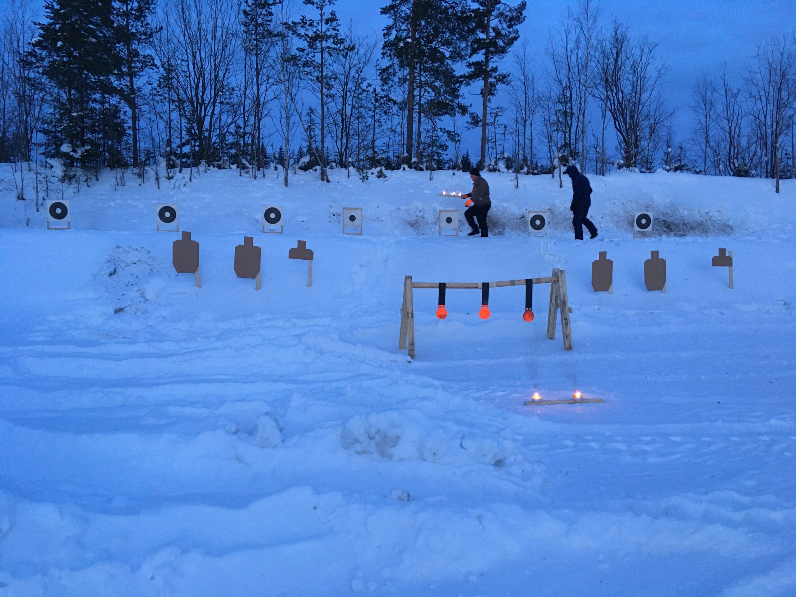 Maalitauluina käytettiin kivääritauluja ja pyöreitä, halkaisijaltaan 17 cm:n metallimaaleja, jotka ripustettiin kierrätyslavoista rakennettuihin telineisiin. Metallimaali kilahtaa selvästi osumasta, ja ainakin valkovenäläisellä pimeätähtäimellä niihin osuminen oli 100 metrin matkalta turhankin helppoa: 10 osumaa/10 laukausta. Pahvitauluihin ilmestyi myös reikiä, ja hyvällä optiikalla varustetulla kiväärillä osui siis heikommassakin valossa riittävän tarkasti. Yritimme myös ampua ruskeita SRA-tauluja, mutta yllätyksenä tuli, että vallille sijoitetuista ulkotulista huolimatta taulut eivät oikein erottuneet paljaalla silmällä lumisesta taustasta, vaikka niitä yritettiin lisäksi valaista ampumakatokselta melkein kaikilla mukana olevilla välineillä. Kontrasti ei pitkällä ampumamatkalla yksinkertaisesti riittänyt.