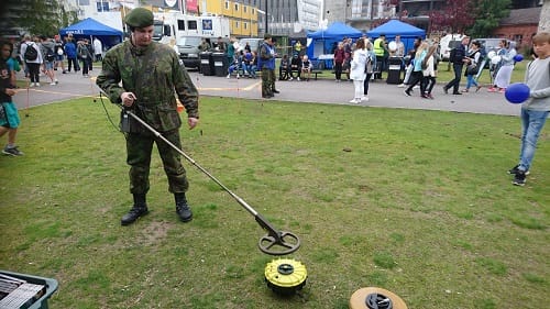 Myös pioneeri- ja suojelutoiminnan esittely oli tärkeä teemamme. Tarjosimme mahdollisuuden tutustua mm. telamiinaan, pohjamiinaan ja miinaharavaan. Isät ja pojat, äidit ja tyttäret tekivät kilvan hauisliikkeitä telamiinalla. Moni muisteli miltä tuntui kantaa kuutta telamiinaa kerralla. Reservin luutnantti Päivi Grönroos esitteli pohjamiinan toimintaperiaatetta ja millaisia herätteitä siinä on. Kentälle hahmotellun, osin raivatun miinakentän tuntumassa reservin vänrikki Jan Falck ohjasi miinaharavan toiminnan testausta. Moni nuorempikin perheenjäsen tunnisti laitteen metallinpaljastimeksi. Suojelutoimintaan liittyvästä säteilyn mittauksesta ja ilmanäytteiden ottamisesta kertoi kollegoiden ohella reservin kapteeni ja kemisti Timo Lukkarinen.