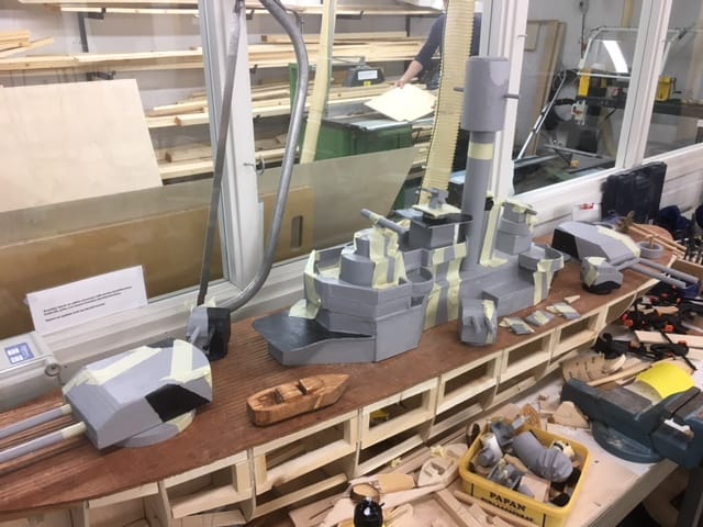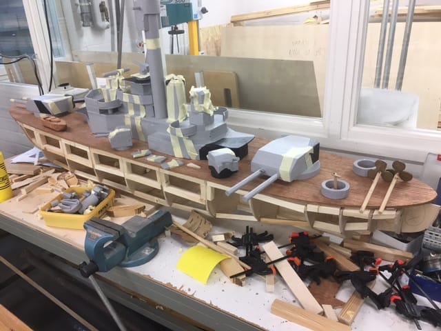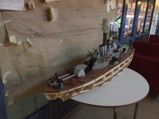 Keskeneräisenäkin panssarilaiva Ilmarinen oli esillä Viherkallion koulun taitoaineiden kurssin näyttelyssä. Näyttelyyn osallistui koulun oppilaiden lisäksi näiden vanhempia ja suuri joukko muitakin sukulaisia. Kuvien taustalla näkyy ruskealle paperille tehdyt laivan piirustukset, joita hyväksikäyttäen oppilaat suunnittelivat ja tekivät laivan kansirakenteita ja laipioita.