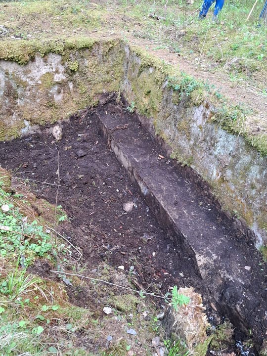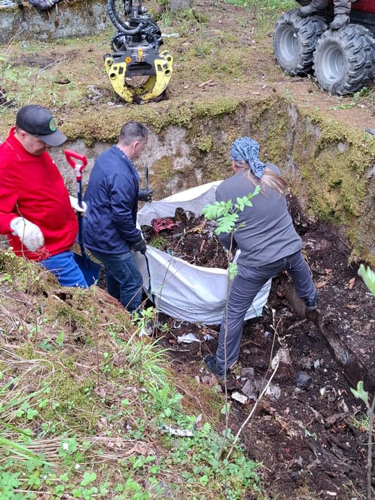 Nyt sitten, torstaiksi 15.5.2025 monumenttimestarimme Jukka masinoi paikalle kaupungin arkkitehdin Heinin, nosturin kauhoineen, kuuden miehen iskuryhmämme ja tietenkin eväitä. Ja roinaa kaivannosta nousi. Roina nostettiin esiin ja Heinin tarkan silmän alla lajiteltiin lasi, metalli, kumi ja muovi erikseen.