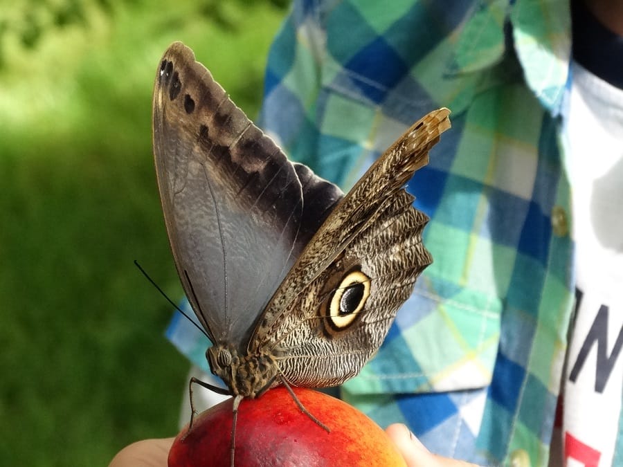 Luonnontieteen museon pihalla oli erillinen kasvihuoneen tyylinen pienehkö rakennus. Siellä oli perhosnäyttely. Olin varautunut vitriineissä oleviin kuolleisiin perhosiin, mutta sisään astuessa totesin tulleeni trooppiseen tilaan, jossa lenteli isoja perhosia. Nämä olivat kämmenen kokoisia. Tämä paikka oli erityisesti lasten suosikki.