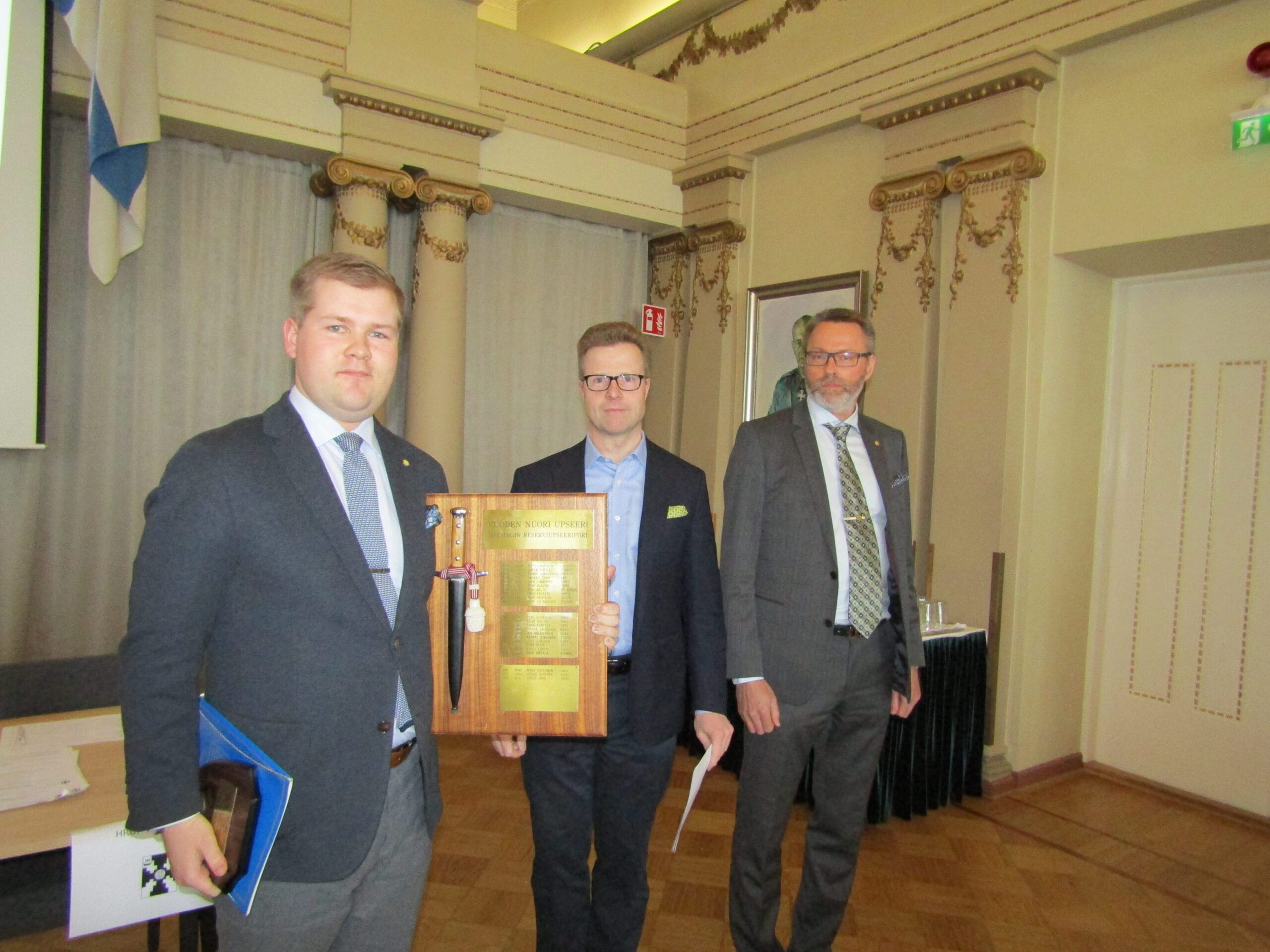 Vuoden nuori upseeri Lasse Mäki sekä piirin puheenjohtaja Matti Riikonen ja 1. vpj Jukka Rusila