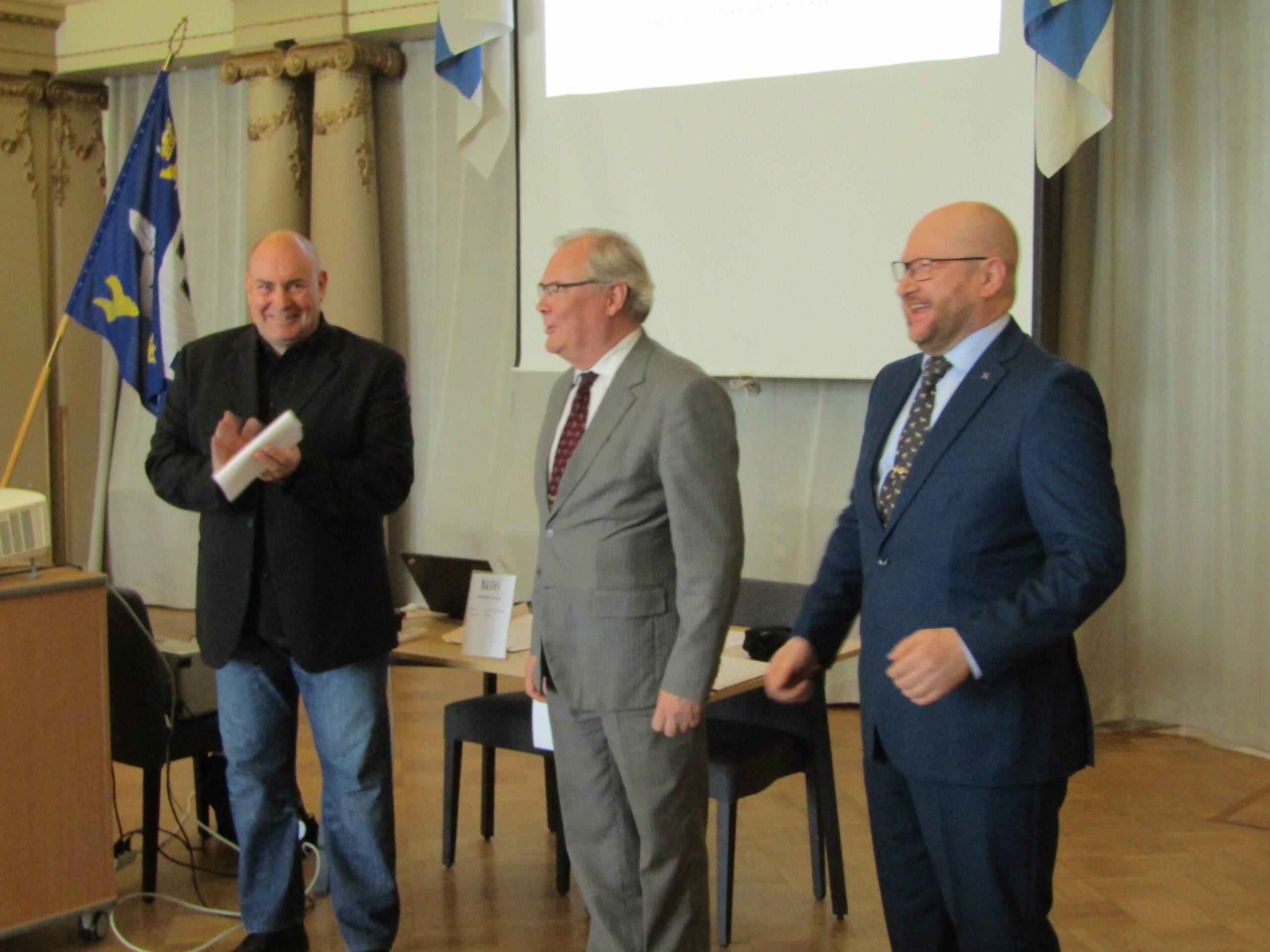Helsingin Seudun Reserviläispiirin uudeksi toiminnanjohtajaksi on valittu monelle tuttu Jari Gerasimoff. Hän esittäytyi lyhyesti, ja aloittaa tehtävässään syyskaudella. Seuraavassa lehdessä saanemme lukea lisää Jarista ja hänen ajatuksistaan. Reserviläispiirin puheenjohtaja Timo Soininen, nykyinen ja tuleva toiminnanjohtaja Kari Talikka ja Jari Gerasimoff saivat kokousväeltä raikuvat aplodit.