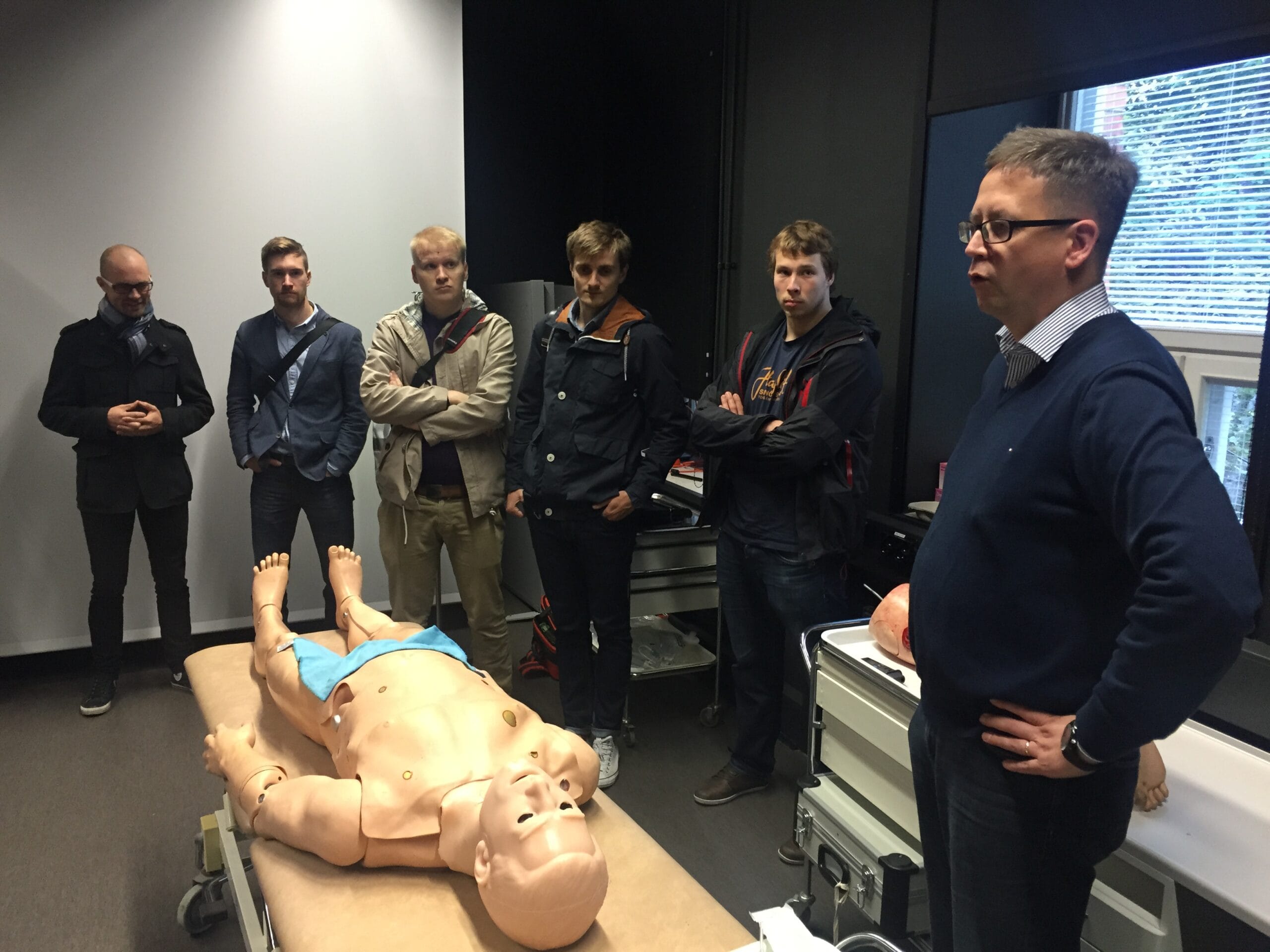 Puolustusvoimien ylilääkäreiden Jaakko Keräsen ja Juha Kuosmasen johdolla koulutuspäivän osanottajat pääsivät myös tutustumaan Sotilaslääketieteen keskuksen uusiin huippumoderneihin simulaatiotiloihin, joita suunniteltaessa oli hyödynnettu mm. teatterialan ammattilaisten osaamista mahdollisimman todenmukaisten olosuhteiden saavuttamiseksi. Lääkintä-RUK:n lisäksi simulaatiotiloissa harjoittelee säännöllisesti poliisin ja rajavartiolaitoksen taktista henkilökuntaa sekä kriisinhallintatehtäviin ulkomaille lähdössä olevia yksiköitä.